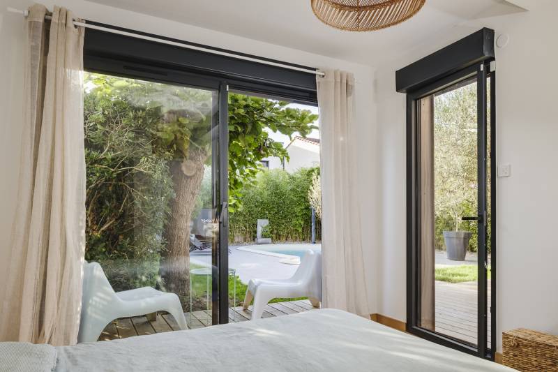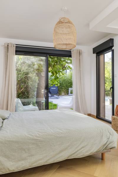 Attenant et jusqu'à la mitoyenneté, la construction de la suite parentale toujours par cube in life composée d'une chambre donnant vers la piscine, d'une salle d'eau, et d'un dressing.