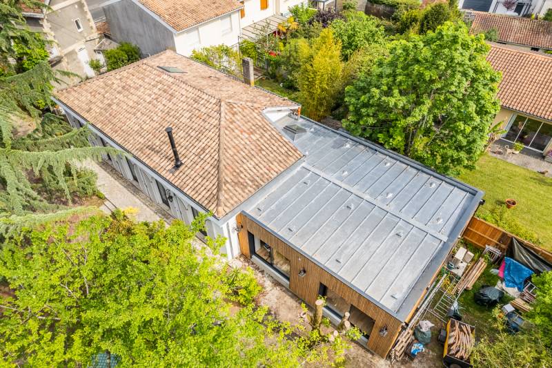 L'agrandissement est réalisé en ossature bois pour permettre un rapidité d'exécution du chantier. La construction de l'extension est dotée d'une charpente avec couverture en zinc à joints debout.
