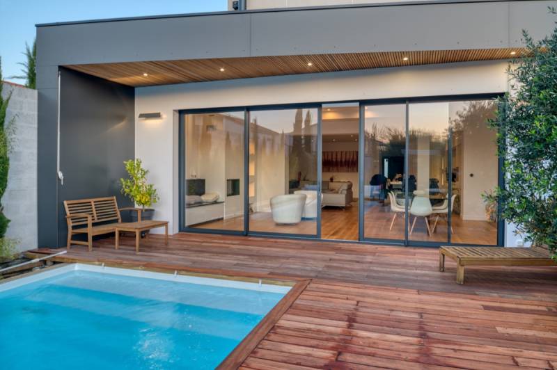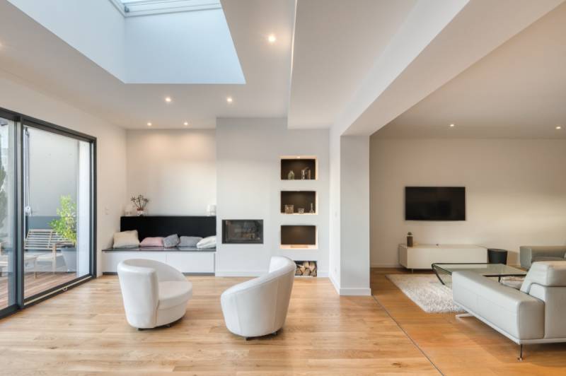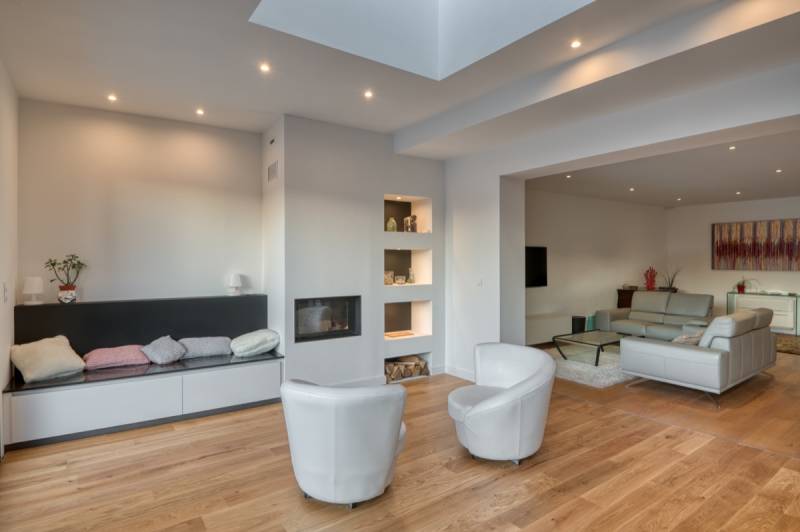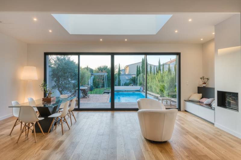 L'objectif des clients était un agrandissement présentant une grande ouverture du mur porteur existant pour rallonger le salon donnant sur la piscine. L'architecture moderne et contemporaine de la maison principale a été gardée par les équipes de Cube in Life. Pour ne pas perdre en luminosité, une grande verrière modulaire Velux a été installée sur le toit plat de notre agrandissement. Pour cela l'étanchéité EPDM a intégré un chevêtre et une rehausse en toiture.