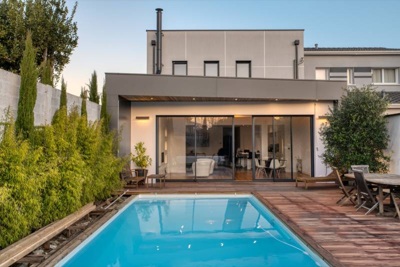 Les contraintes de ce projet d'agrandissement de maison sur le Bouscat à coté de Bordeaux en Gironde ont été nombreuses. Micropieux en fondations, passage très étroit pour les matériaux, grutage avec cables dans la rue... mais des travaux sans encombres par les équipes de cube in life et un projet superbe.