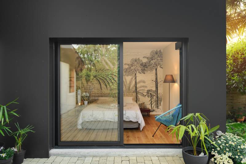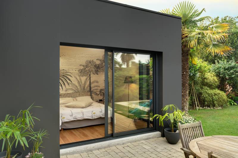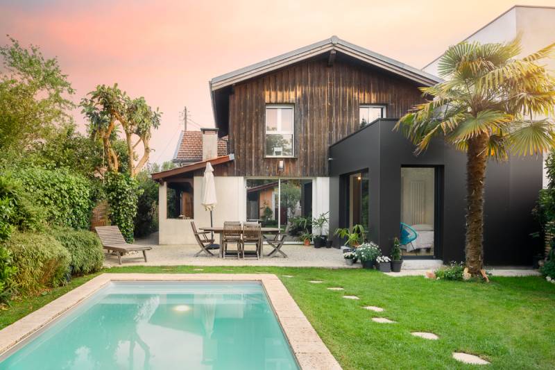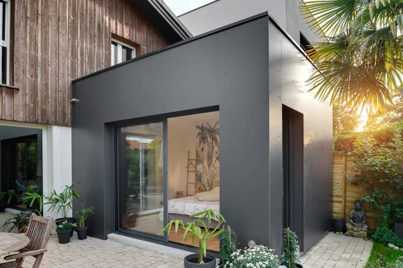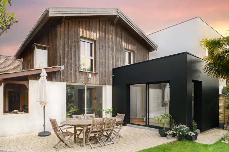 Cube in Life a su travailler sur les revêtements de façade afin de réussir l'architecture de la maison. Le panneau bois compact anthracite permet de ne disposer d'aucun entretien, mais également de donner une touche très moderne à l'agrandissement de cette maison de Pessac à coté de Bordeaux.